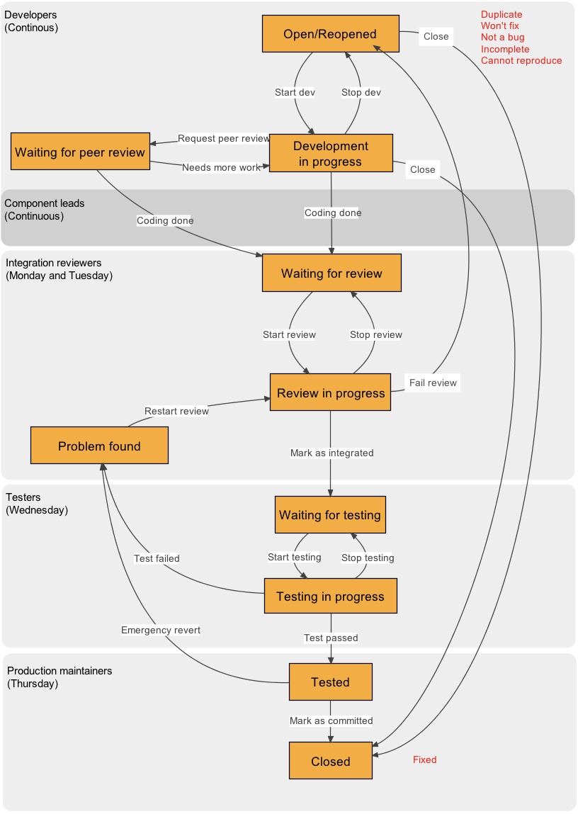 It will then be reviewed the following week by one of the integration team and either integrated or rejected. Once integrated, the fix will be tested, and then included in the next weekly release. For details see Integration Review.